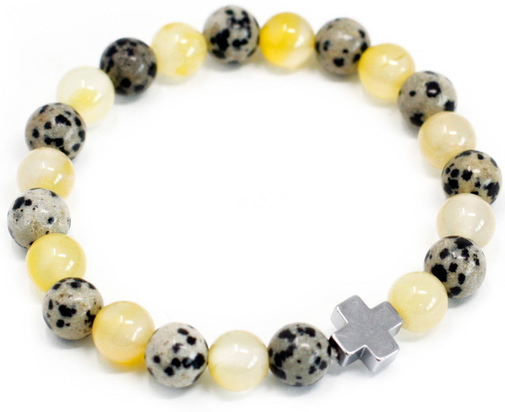 Zapestnici dalmatinskega jaspisa (harmonija, zaščita) in rumenega ahata (samozavest) sta narejeni iz kroglic premera 8 mm. Popolno darilo za 2 prijatelja ali prijateljici, za vsakogar.
