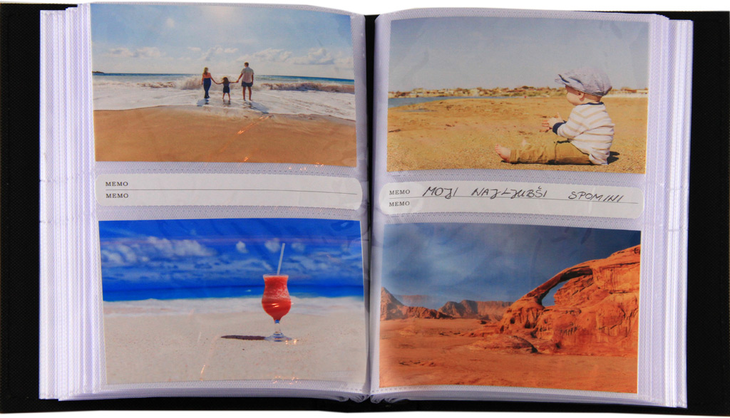 V vložni album z memo prostorom lahko shranite 200 fotografij dimenzije 10×15. Slike vložite y plastične žepke v fotoalbum.Vsaka stran ima memo prostor kamor vpišete spomine.