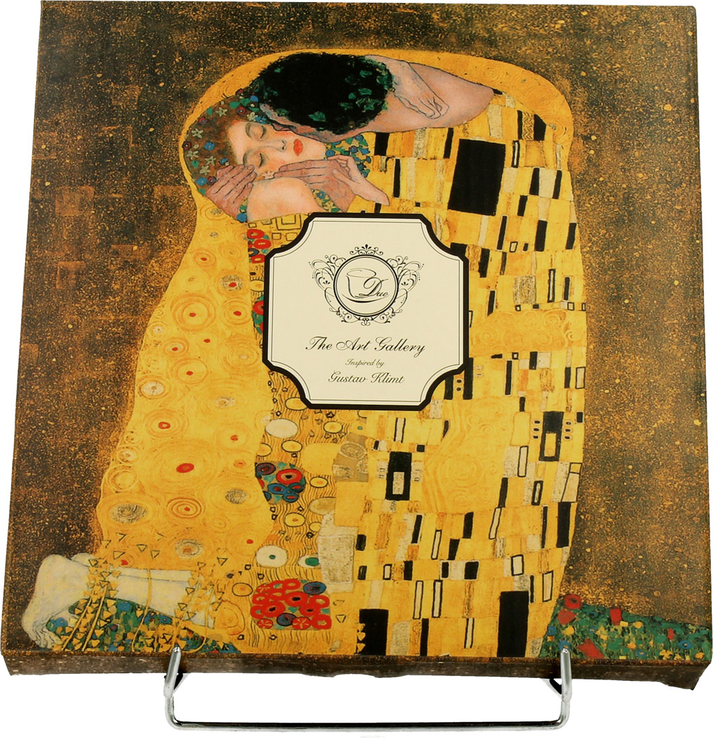 Eleganten set 2 krožnikov za desert in podobno. Priljubljen motiv Poljub priznanega umetnika Klimt. Lična embalaža, nadvse primerna za darilo.