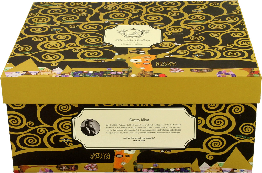 Eleganten set 2 skodelic in krožničkov za kavo ali čaj. Priljubljen motiv Drevo življenja priznanega umetnika Klimt. Porcelan, 250 ml. Lična embalaža, nadvse primerna za darilo.