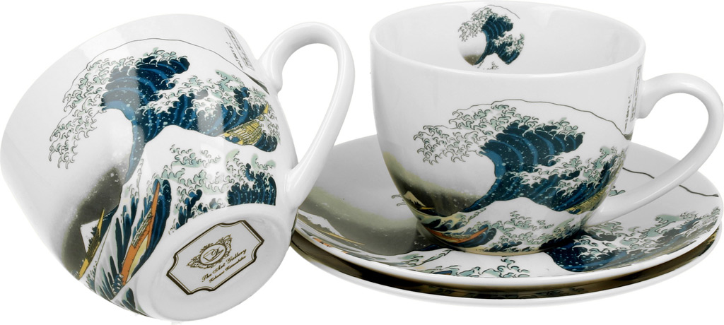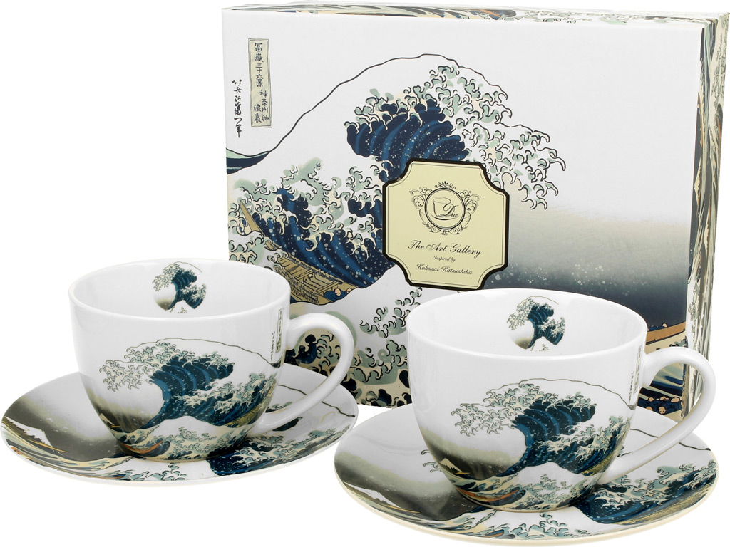 Eleganten set 2 skodelic in krožničkov za kavo ali čaj. Priljubljeni motiv Veliki val priznanega umetnika Hokusai. Porcelan, 280 ml. Lična embalaža, nadvse primerna za darilo.