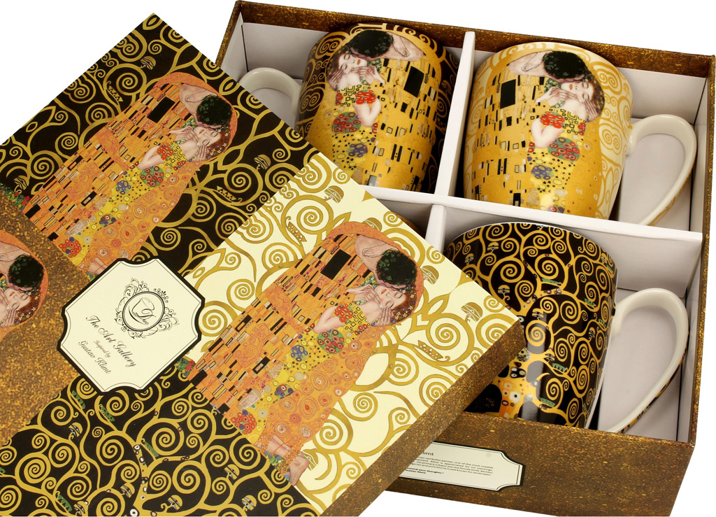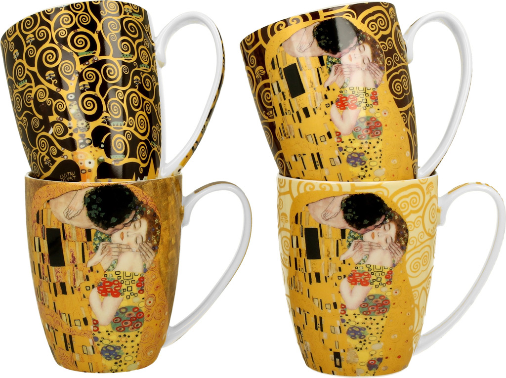 Eleganten set 4 skodelic iz porcelana za kavo ali čaj. Priljubljeni motivi priznanega umetnika Klimt. Porcelan, 360 ml. Lična embalaža, nadvse primerna za darilo.