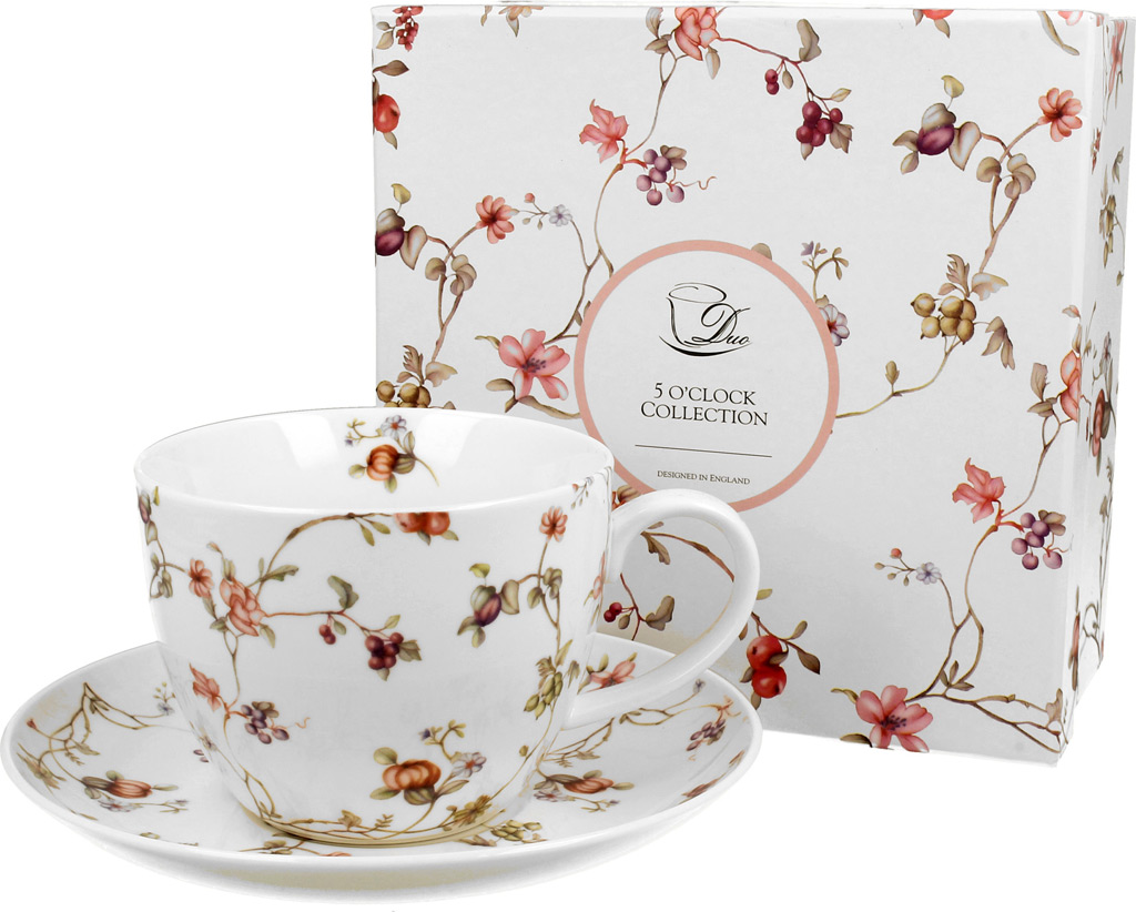 Eleganten komplet velike skodelice in krožnička. Prikupni cvetni motiv Safa. Porcelan, 470 ml. Lična embalaža, nadvse primerna za darilo.