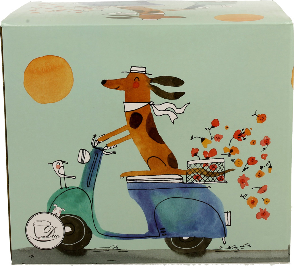 Elegantna skodelica iz porcelana za čaj, vodo, sok ali juho. Priljubljen motiv psička na skuterju. Porcelan, 1000 ml. Lična embalaža, nadvse primerna za darilo