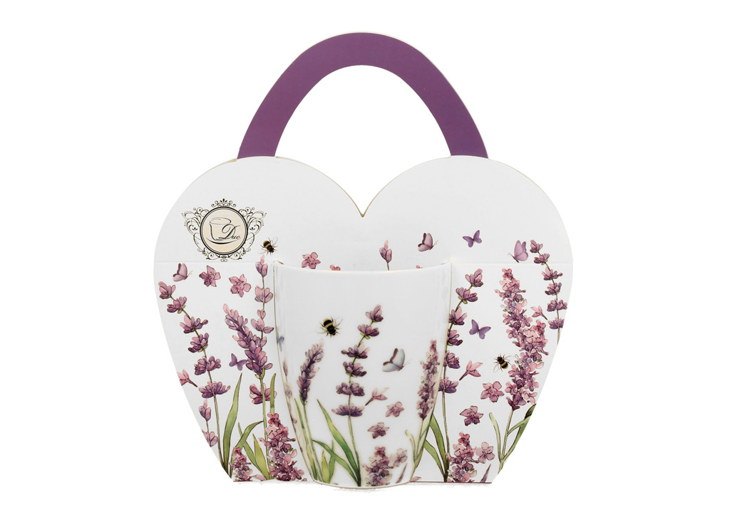 Elegantna skodelica iz porcelana za kavo ali čaj. Priljubljen motiv sivke. Porcelan, 360 ml. Lična embalaža, nadvse primerna za darilo