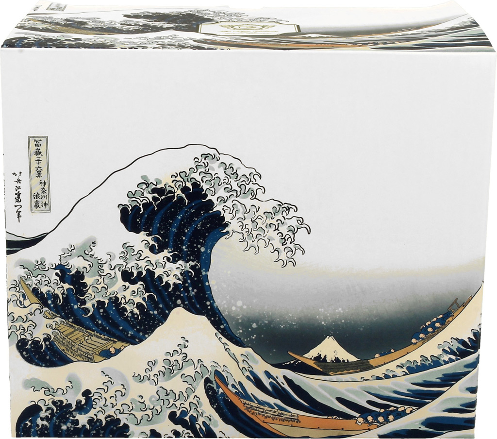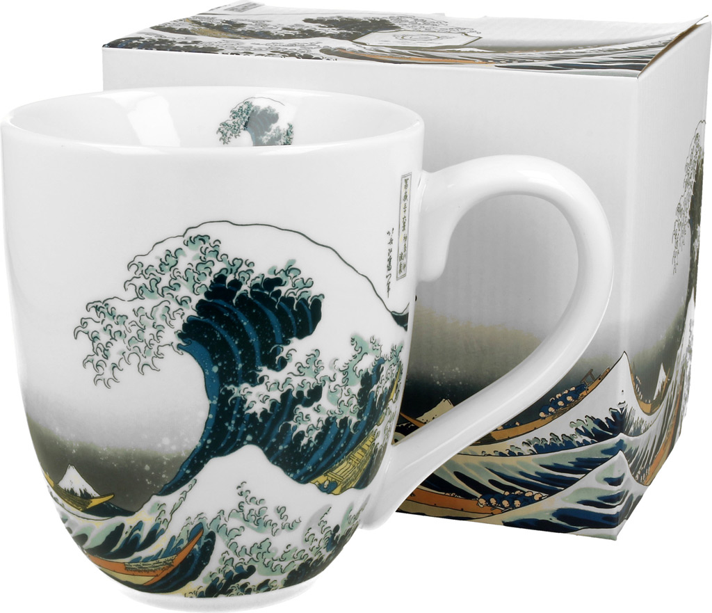 Elegantna skodelica iz porcelana za čaj, vodo, sok ali juho. Skodelica zadrži 1000 ml. Motiv Veliki val priznanega umetnika Hokusai. Lična embalaža, nadvse primerna za darilo.