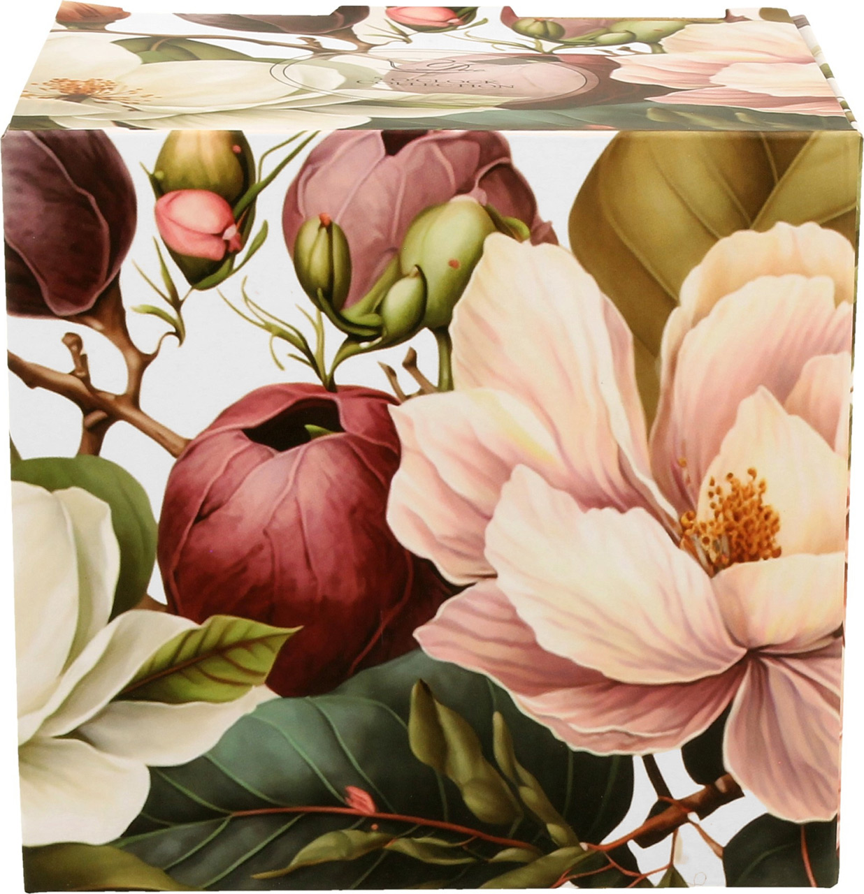 Eleganten komplet skodelice, pokrova in cedila za čaj. Priljubljen motiv magnolije. Porcelan, 430 ml. Lična embalaža, nadvse primerna za darilo.