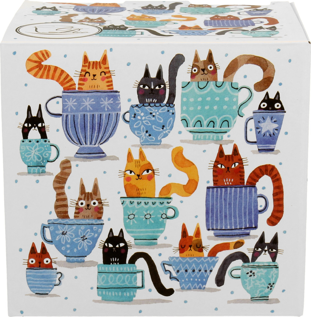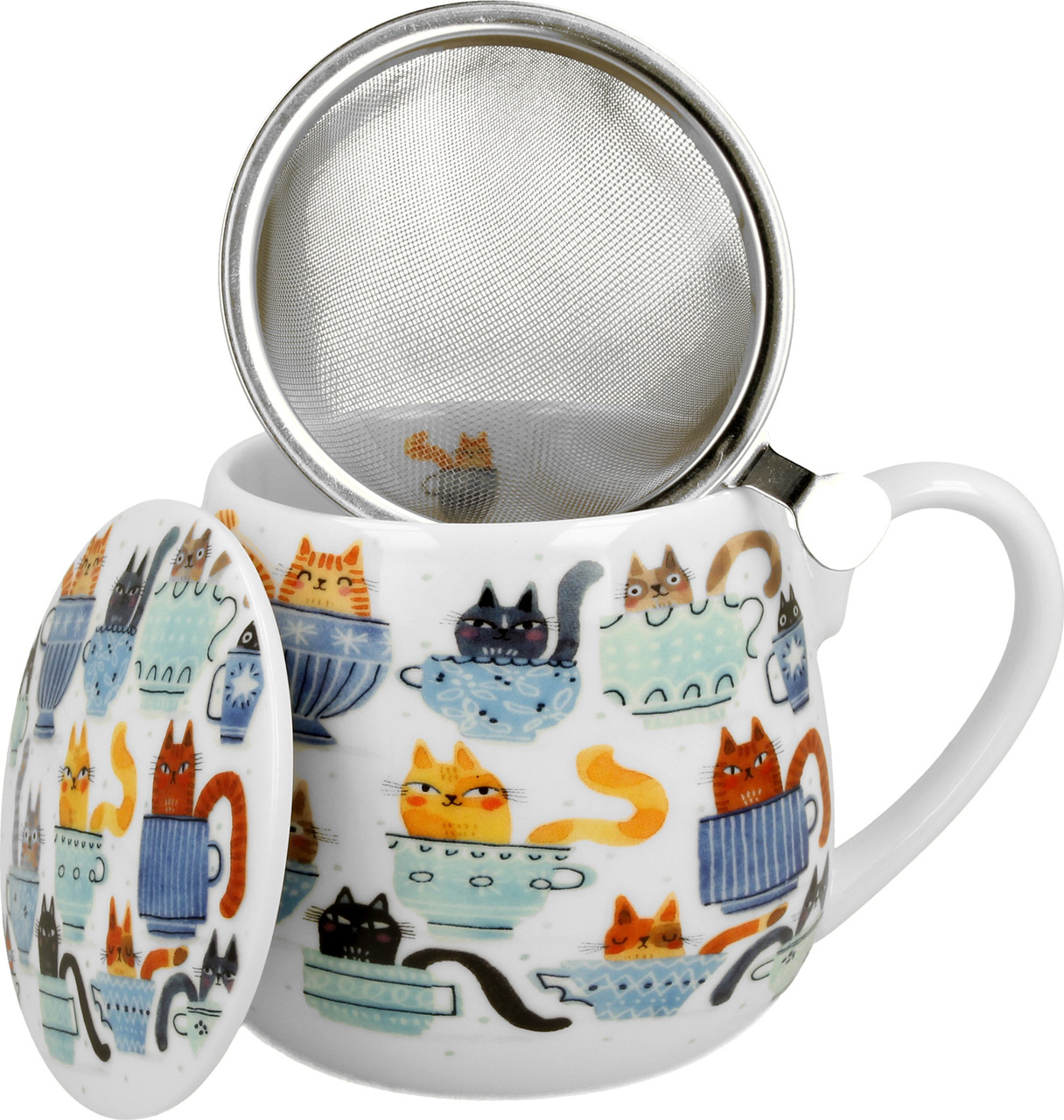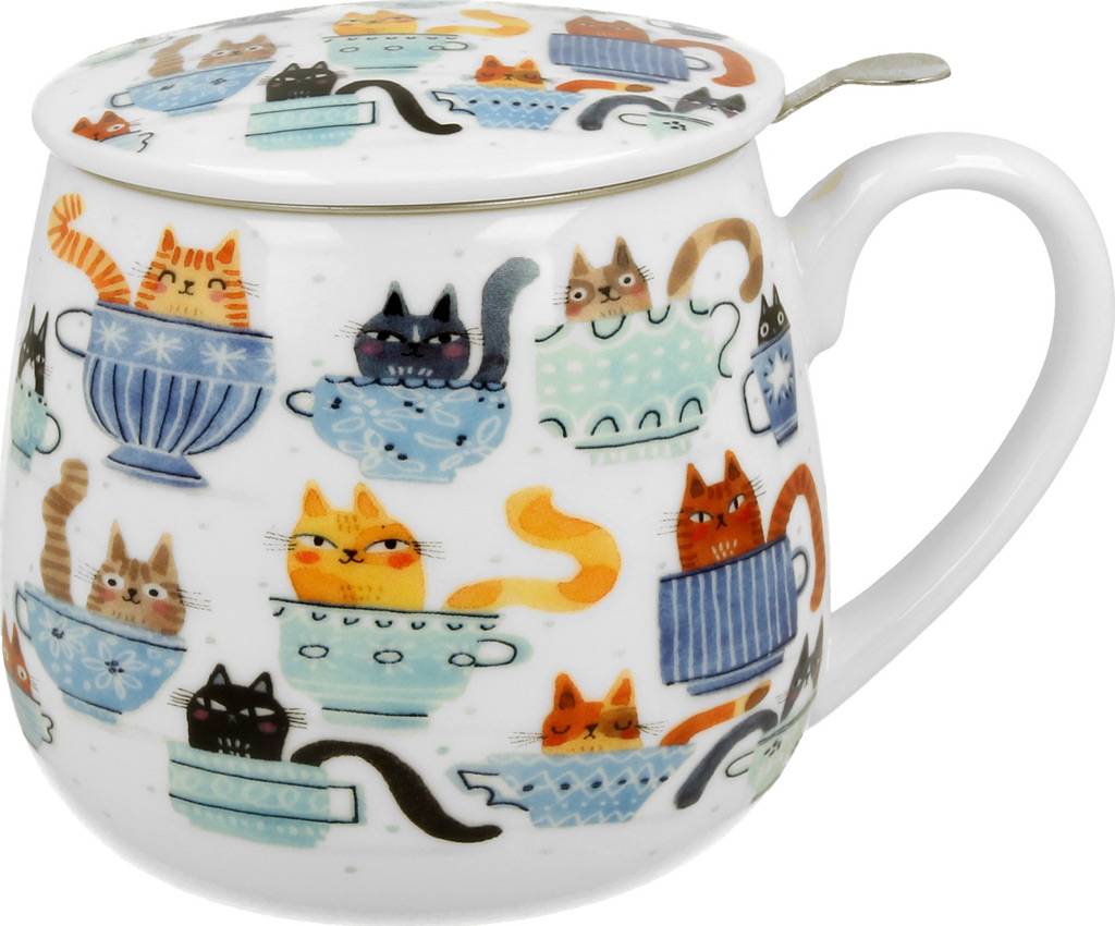 Eleganten komplet skodelice, pokrova in cedila za čaj. Navihan motiv muckov na čaju. Porcelan, 430 ml. Lična embalaža, nadvse primerna za darilo.