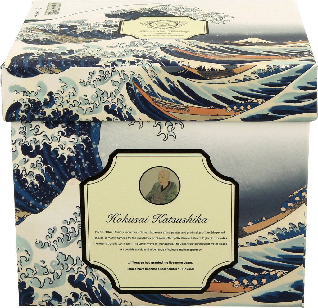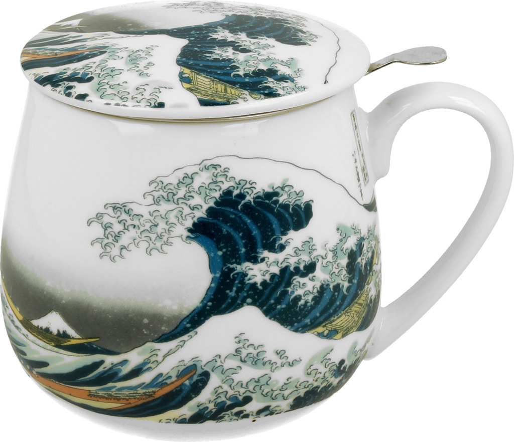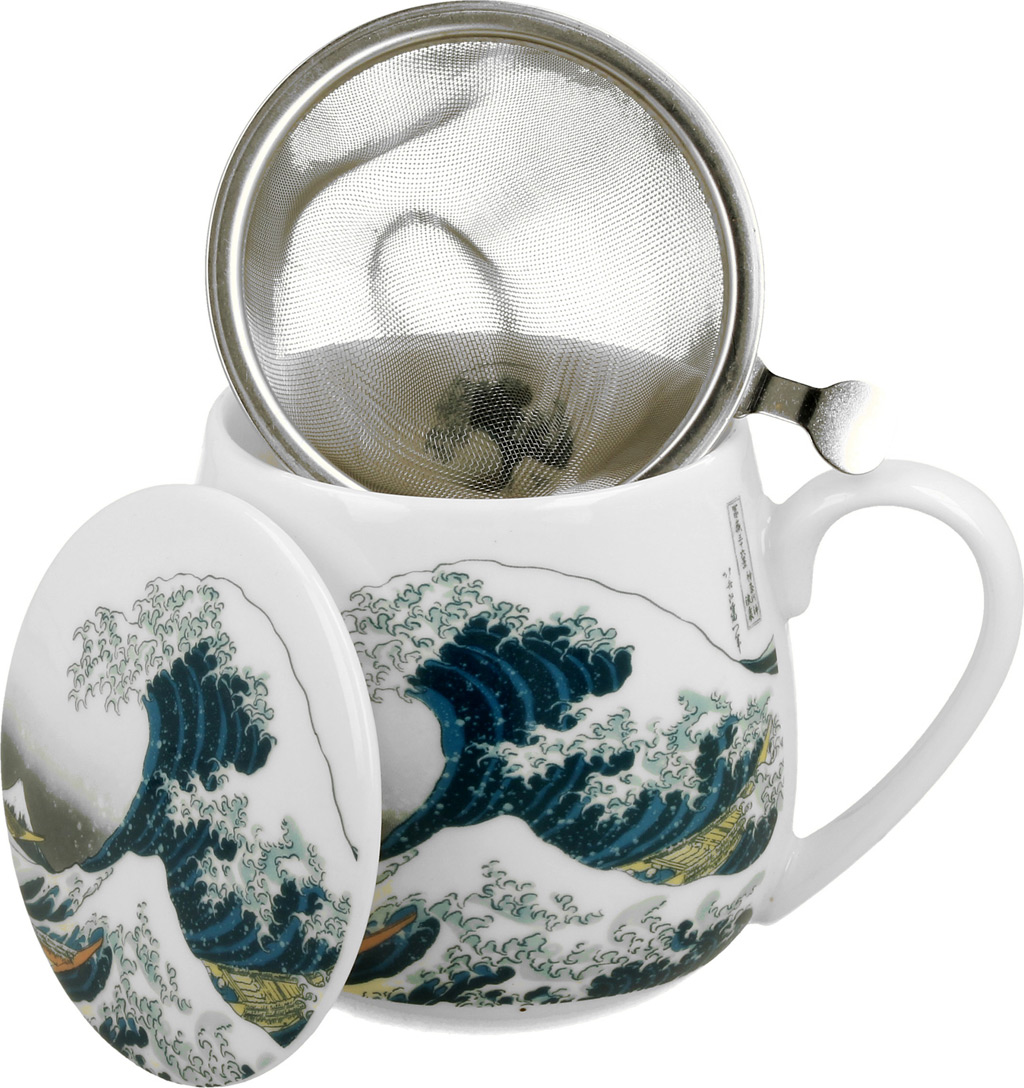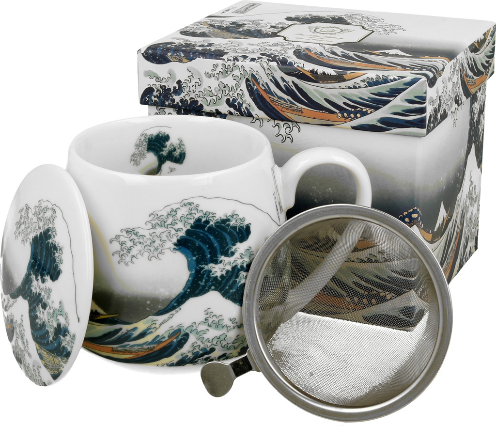 Eleganten komplet skodelice, pokrova in cedila za čaj. Priljubljen motiv Veliki val priznanega umetnika Hokusai. Porcelan, 430 ml. Lična embalaža, nadvse primerna za darilo.