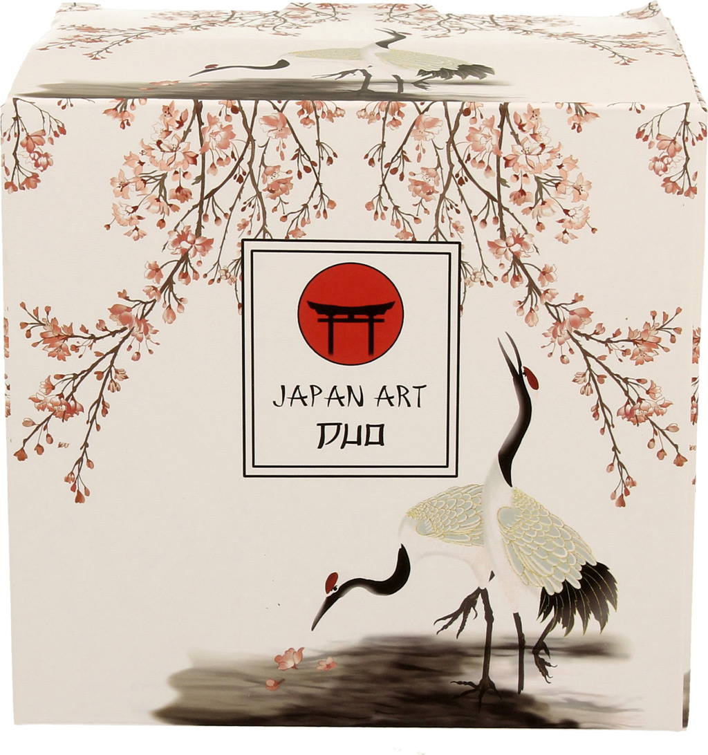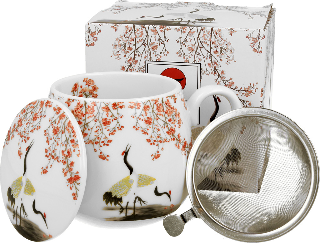 Eleganten komplet skodelice, pokrova in cedila za čaj. Moderni japonski motiv Žerjav. Porcelan, 430 ml. Lična embalaža, nadvse primerna za darilo.